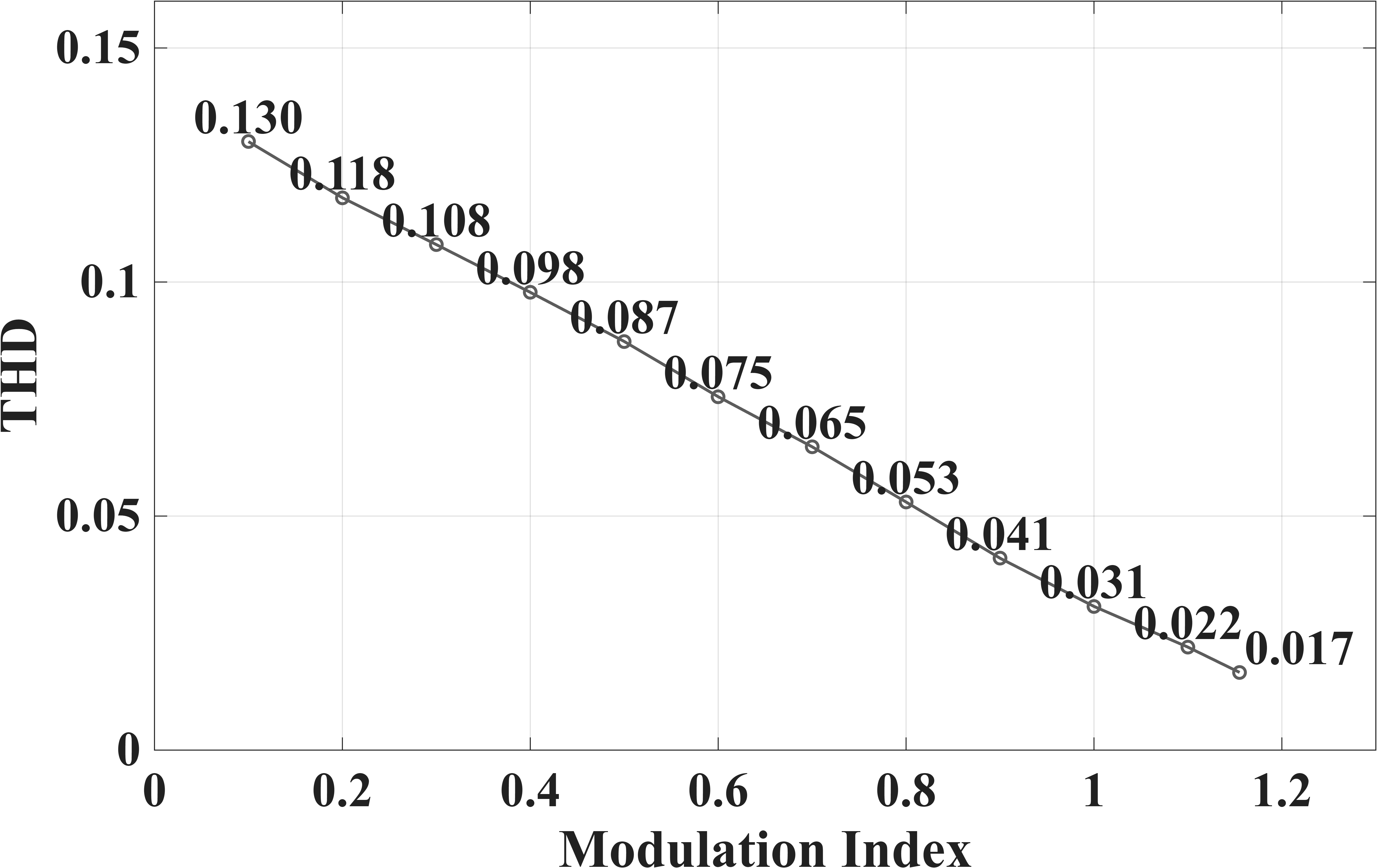 ๊ฐ์ฅ ๋๊ฒ ๋ํ๋๋ฉฐ, ๋ณ์กฐ์ง์๊ฐ 1.0์ ๋๋ฌํ๋ฉด 2.3%๋ก ๊ธ๊ฒฉํ ๊ฐ์ํ๋ค. ์ด๋ SPWM ๊ธฐ๋ฒ์ด ์ถฉ๋ถํ ํฌ๊ธฐ์์ ๋ณ์กฐ๋์ด์ผ ์ ํํ์ ๊ฐ๊น์ด ์ ์์