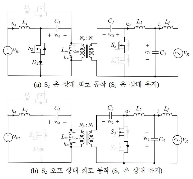law)를 이용하여 기준 듀티비를 도출할 수 있다. 그림 4(a)를 기반으로 L1, L2, Lm에 걸리는 전압에 대해 정상상태 조건을 적용하면 아래와 같은 수식을 얻을 수 있다.