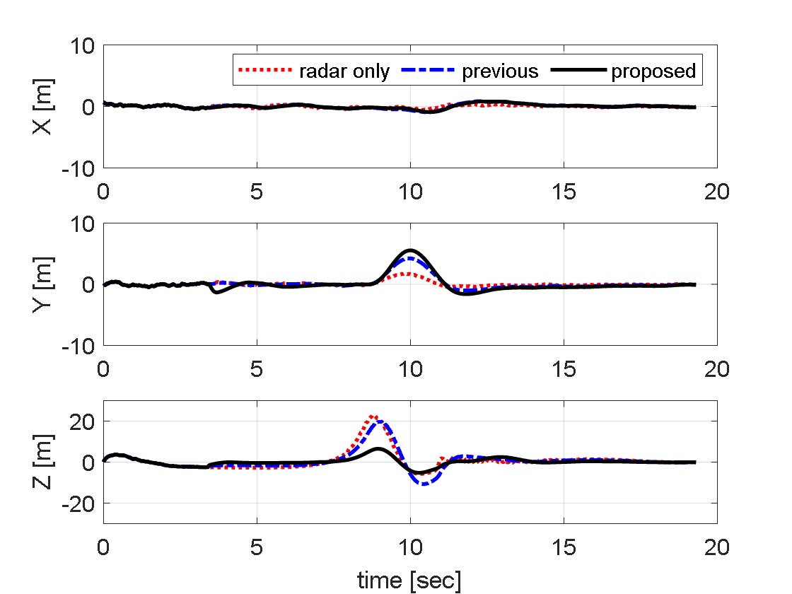 기인한다. 반면, 기존 OOSM 필터는 전자광학 센서가 제공하는 양질의 정보를 역전파를 통해 단회성으로만 융합하기 때문에, 레이더 측정치의 편향 오차가