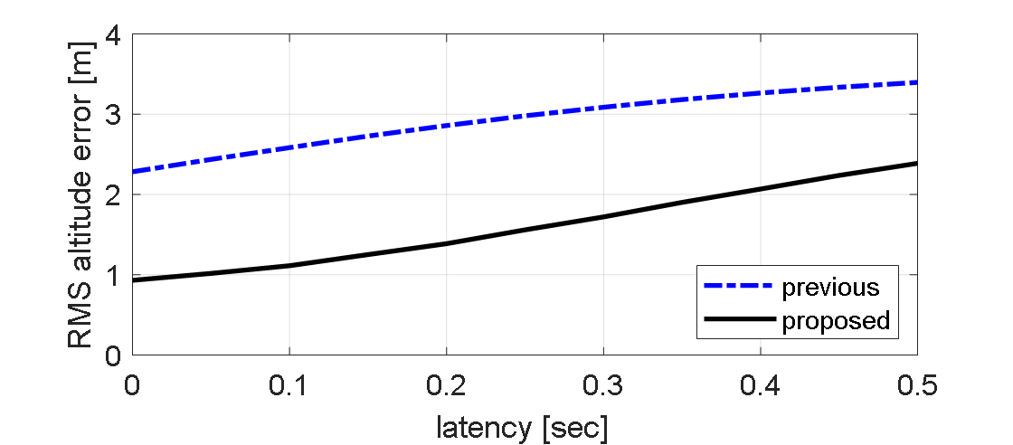 셋째, 제안기법은 보조센서의 시간지연 불확실성에 영향을 덜 받는다. 시간불일치 보상필터 설계 과정에서 시간지연을 시스템 모델의 파라미터로 사용하게