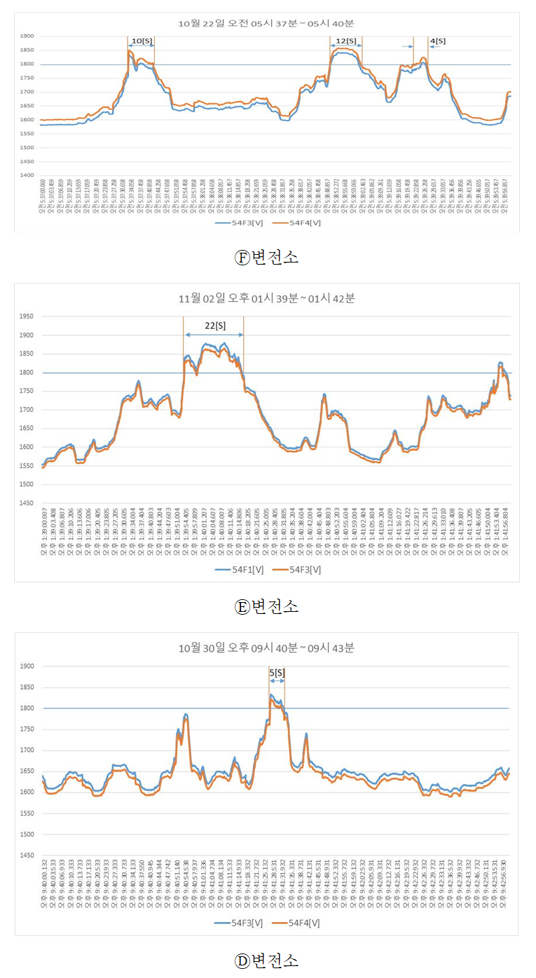 측정한 결과 Ⓔ변전소 및 Ⓕ변전소에서는 회생 제동에 의한 가선 전압이 1,800V 이상 상승하여 수십 초간 지속하는 것을 분석하였다.
