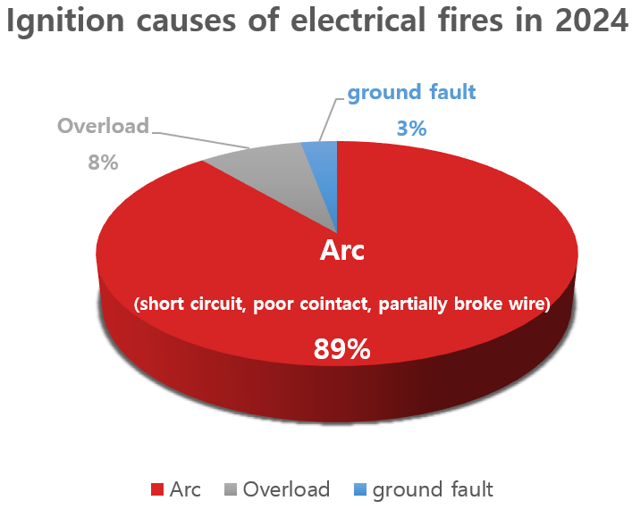 전기적 아크는 느슨한 접속, 절연 열화, 오염·습기 등으로 발생하며 저압 분기회로 화재의 주요 기점이다. 그림 1의 아크 89%는 전기안전공사의 전기재해통계분석에서 제공하는 단락(절연파괴·트래킹·손상·중간·미확인), 접촉불량, 반단선을 묶어 집계한 항목에 해당한다.