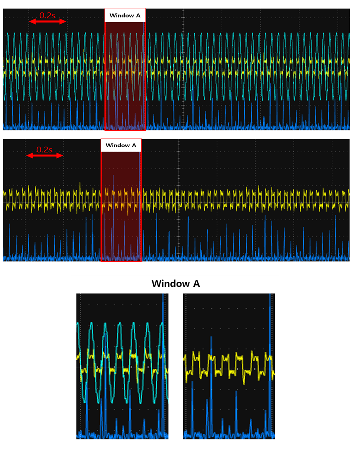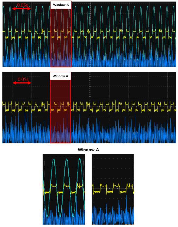 그림 13은 16A 조건의 전압과 전류, UVC 동시 파형을 제시한다. 앞에서와 동일하게 아크 형성 시 전류의 주기적 왜형과 UVC의 짧은 반복 펄스가 동시