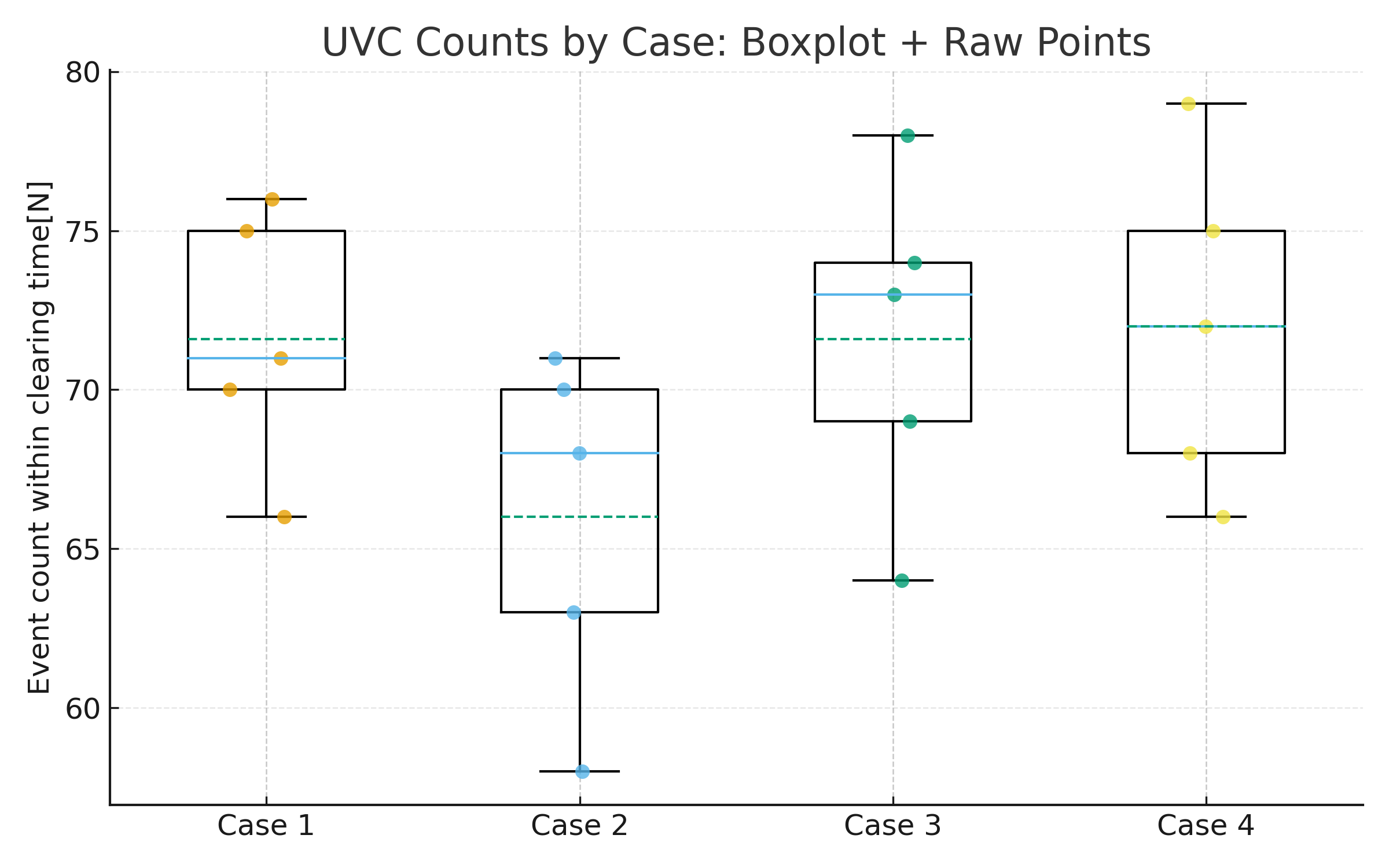수행하였다. UVC 이벤트 계수 평균은 Case 1-4에서 71.6, 66.0, 71.6, 72.0회, 표준편차 4.04, 5.43, 5.32, 5.24회였고