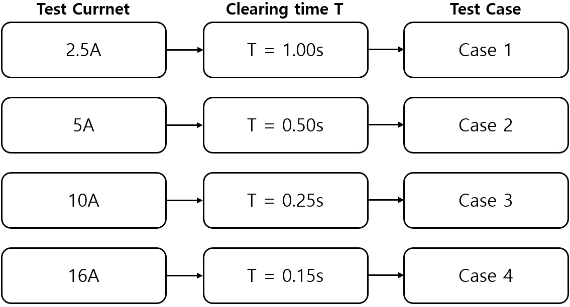 평가하였다. 전류는 2.5, 5, 10, 16A에 대해 관측창은 1.00, 0.50, 0.25, 0.15s를 매핑하고 각 조건 5회씩 총 20회 시험을