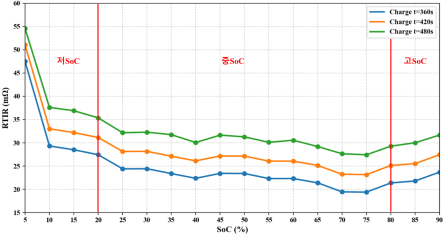 반면 중SoC(20~80%) 구간에서는 충·방전에서 가장 안정적인 내부저항 특성을 보였다.