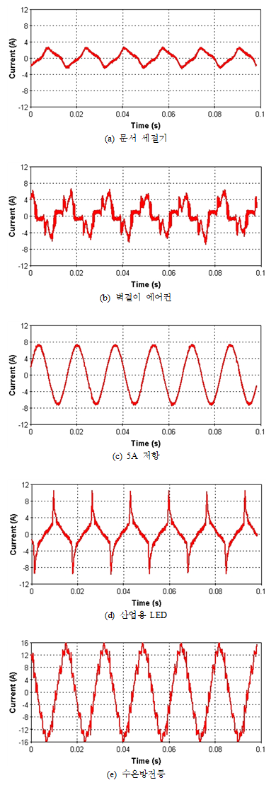 그림 6c는 5A 저항부하의 순시전류로 깨끗한 정현파를 띈다. 문서 세절기는 삼각파(그림 6a), 에어컨 부하는 인버터의 스위칭 제어에 의해 비선형적인 전류 형태가 대표적으로 나타난다(그림 6b). 이외에도 제품에 따라 독특한 형태의 전류파형을 확인할 수 있다. AFDD는 전류의 형태와 주파수 특성을 고려해 개발된 알고리즘에 따라 작동하므로