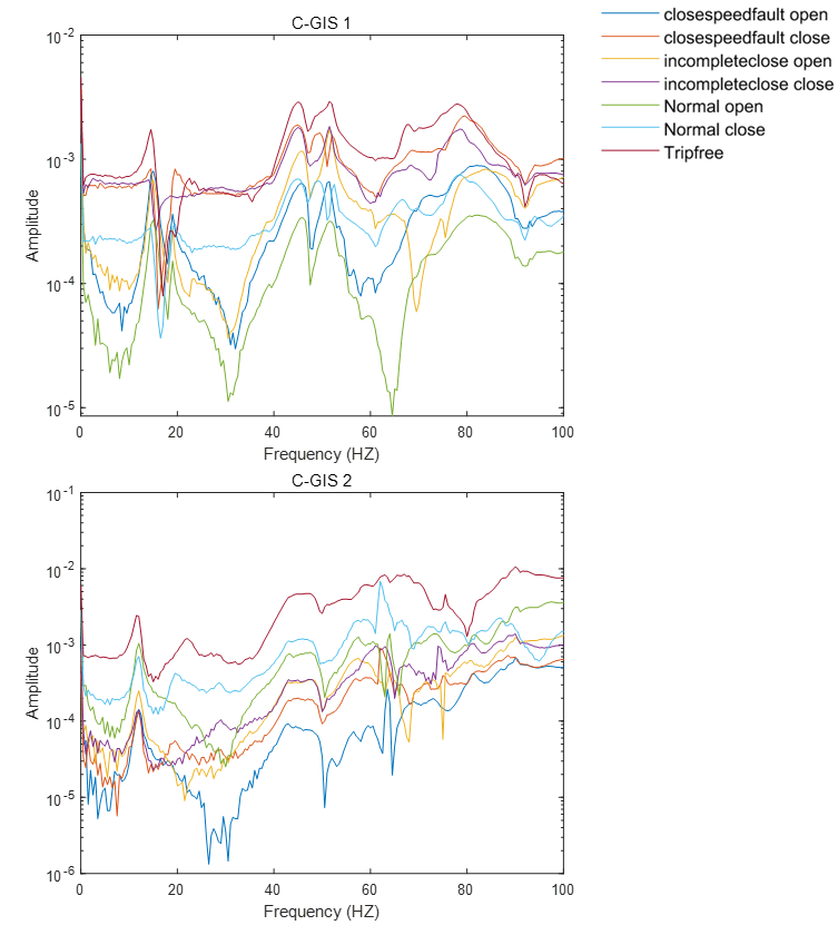 C-GIS에서 발생하는 정상, 결함 신호의 open, close 신호는 FFT를 한 다음, 저주파 영역을 관측하면 Fig. 2와 같이 그 차이가 두드러진다. 구조적 특징에 기인하는 피크 값에 해당하는 주파수는 대체로 모든 신호에서 동일하나, 해당 신호가 open 및 close