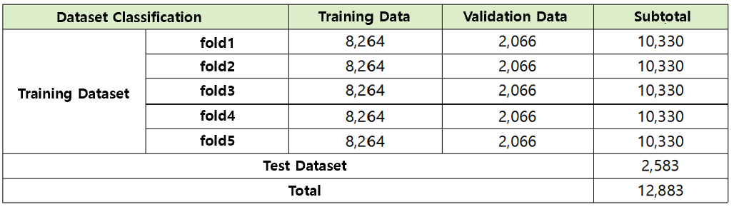 본 연구에서 모델 학습의 일반화 성능을 높이고 과적합을 방지하기 위하여 훈련/평가 데이터 분할 및 교차검증 전략을 적용하였다[9]. 전체 데이터 13,255중 전처리 과정을 거쳐 노이즈 데이터 372건을 제거하여 최종적으로 12,883건으로 데이터셋을 구성하였다. 전체 사고