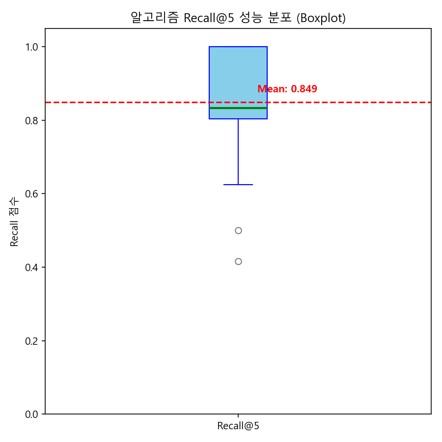 추천 시, 정답을 얼마나 회수(Recall)하는지를 평가한다. Recall@5기준으로 평가 결과, 84.9%로 평가된 것을 확인 할 수 있었다.