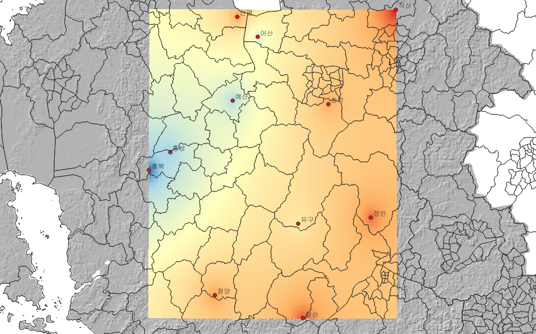 ์์น์ ๊ฐ์ผ๋ก ๋ณํํ๊ธฐ ์ํด ๊ณต๊ฐ ๋ณด๊ฐ๋ฒ์ ์ ์ฉ์ด ํ์ํ๋ค. ์ญ๊ฑฐ๋ฆฌ๊ฐ์ค๋ฒ (IDW, Inverse Distance Weighting)์ ๊ฐ๊น์ด ์๋