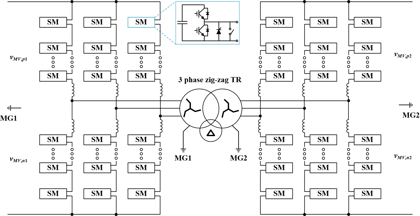 구성된다. 각각의 SM은 SMI(sub-module interface)와 통신하여 능동 소자의 제어 및 자기 보호를 수행한다. 그림 2는 MVDC-MVDC 컨버터 스테이션의 구성을 보여주며, 이의 주요 사양은 표 1과 같다. 그림 3은 3상 zig-zag 변압기의 결선도를 보여준다.