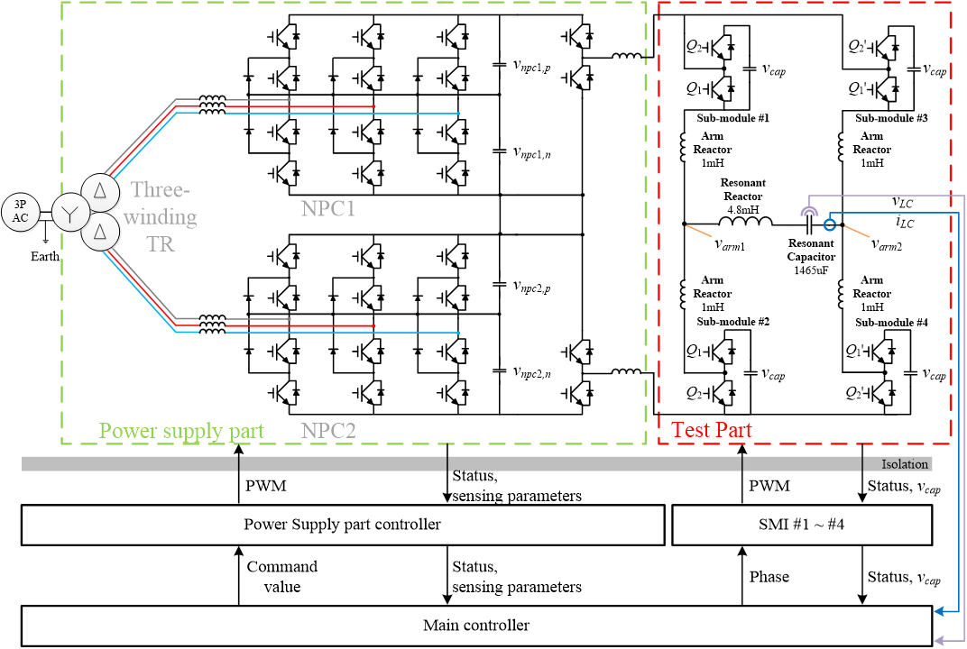 power supply part(PSP)와 test part(TP)로 구성된다. PSP는 3-level NPC 컨버터의 직렬 구성으로 TP의 입력