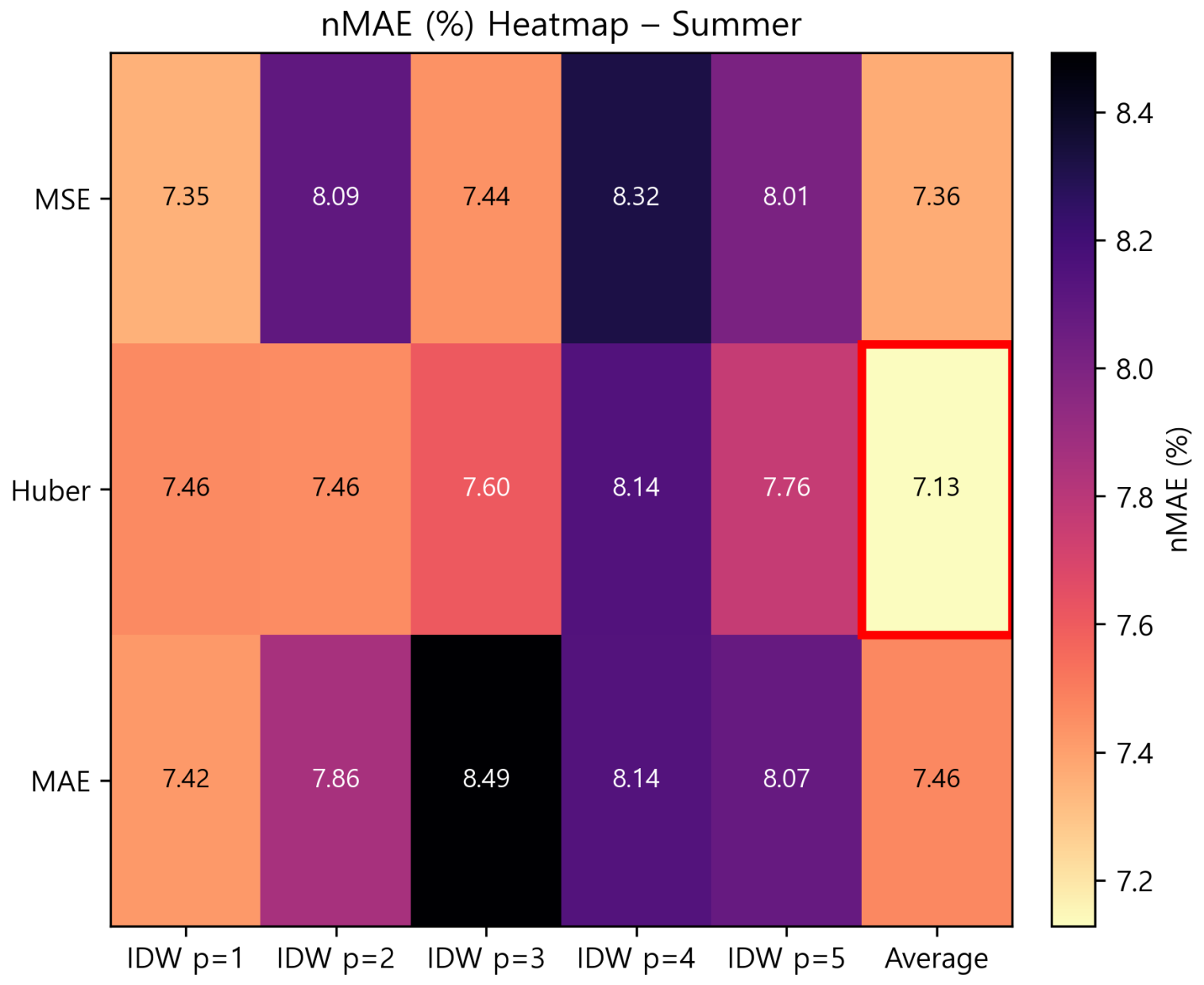 ๋ฐ Pseudo-Huber, ๊ฐ์์ IDW p=1 ๋ฐ Pseudo-Huber, ๊ฒจ์ธ์ IDW p=4 ๋ฐ MAE๊ฐ ๊ฐ๊ฐ ์ต์ nMAE๋ฅผ ๋ณด์๋ค. ์ด๋