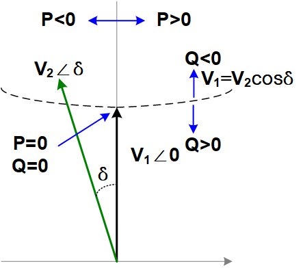 위상이 앞선다면(V1의 왼쪽) 유효전력은 (-)가 된다. 반대로 위상이 뒤진다면(오른쪽) 유효전력은 (+)가 된다. 유효전력이 (+)이면 V1에서