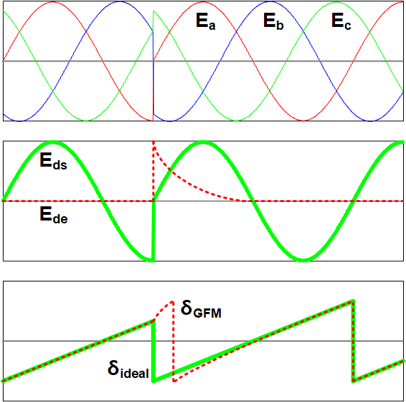 위상각에 따르면 동기좌표계 d축 전압(Ede, 점선)은 일정한 값을 유지한다. 유효전력을 일정하게 유지한다면 GFM 제어기 내부의 위상각(δGFM,