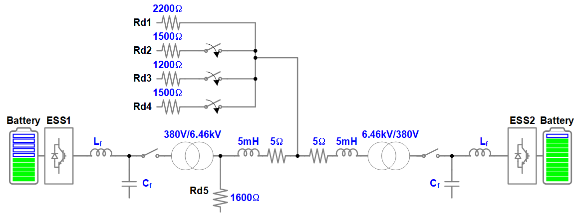 그림 10은 전형적인 GFM 제어기를 적용한 시뮬레이션 결과이다. ESS1의 위상각이 90° 느리게 이동하기 때문에 (-)로 감소하던 ESS1의 ab 선간전압(Vab_ESS1)이