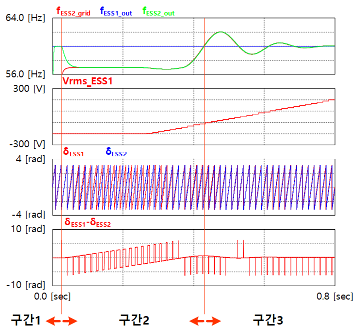 2.5초 이후에 ESS2의 ab 선간전압(Vab_ESS2)보다 위상이 느려진다. 즉, 2.5초 이후에는 ESS2 제어기에서 출력하는 전압 위상각이