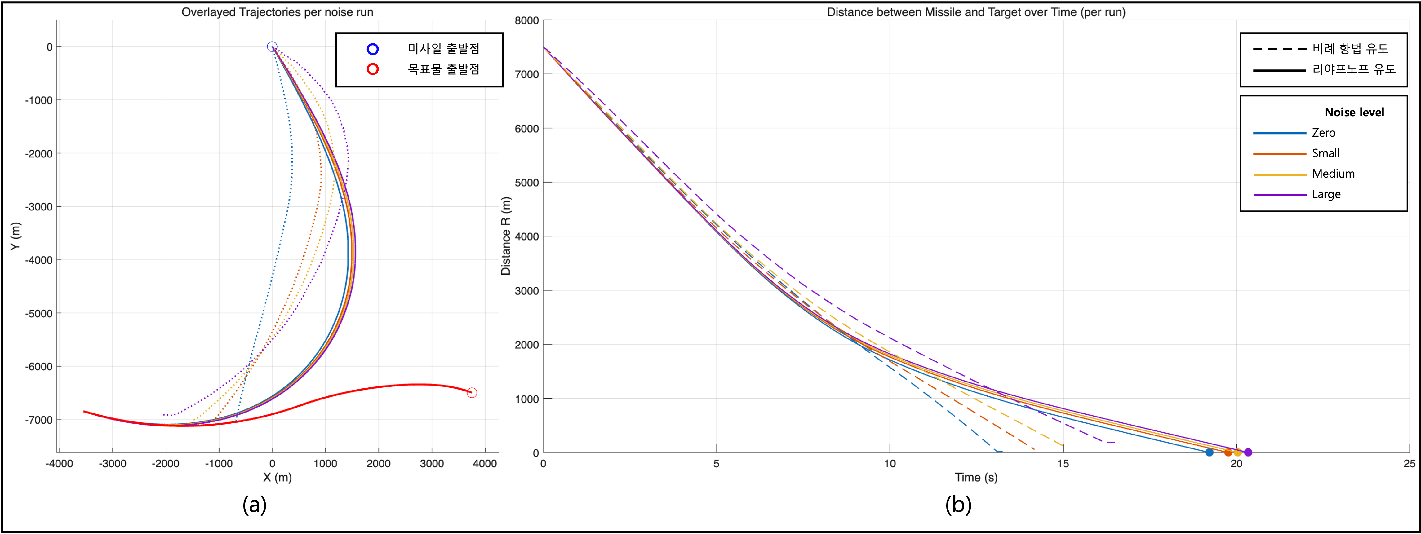0으로 수렴시키는 유도 법칙을 설계한다[10,15]. 파라미터 변동성을 다루기 위해 사용한 tanh 함수는 리야프노프 안정도 이론과 함께 시스템의 안정성을 보장하며, 센서 노이즈, 목표물의 불규칙