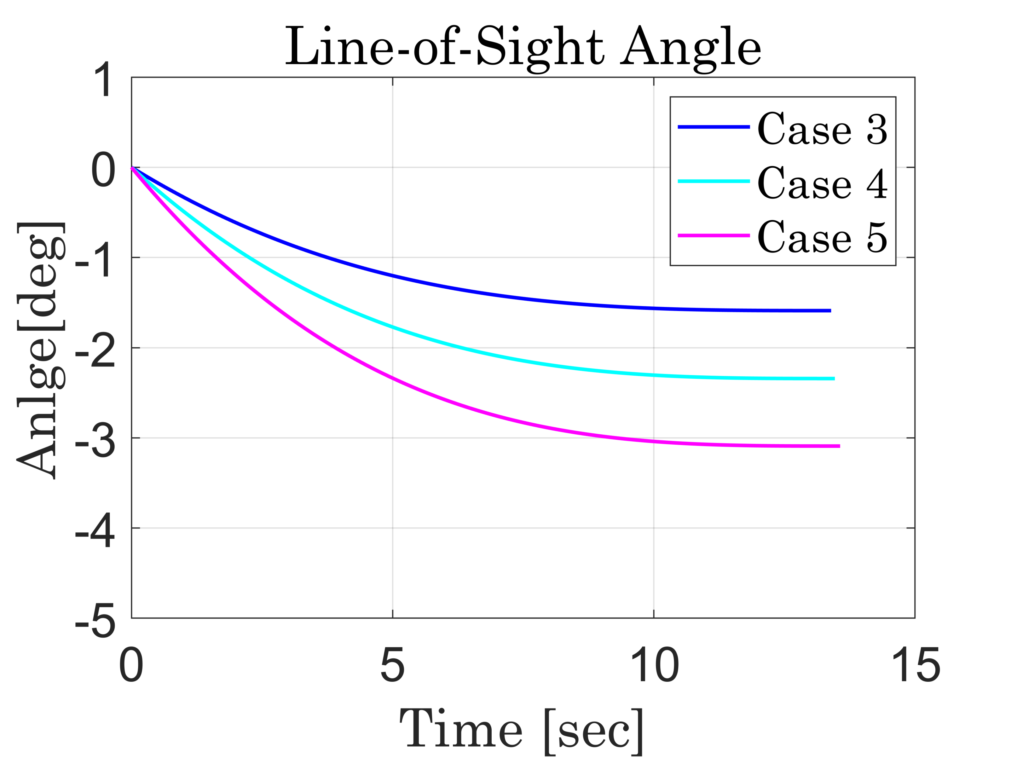 Fig. 6. LOS Angle(Case3:$x_{c}$,Case4:$x_{c}$-$0.5\times 10^{4}$,Case5:$x_{c}$-$1.0\times