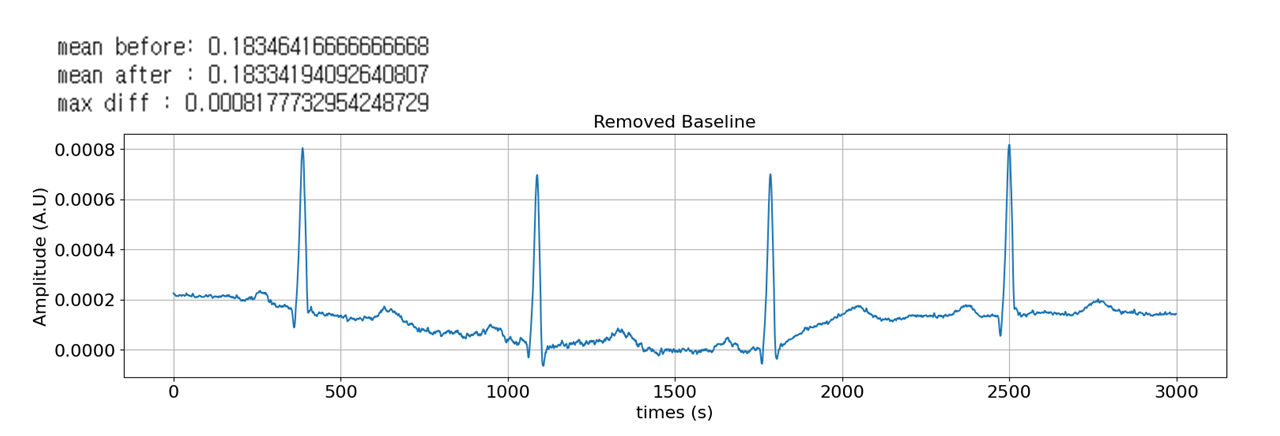 필터(High-Pass Filter)[9] 적용 후 신호는 전체 구간에서 기준선이 안정적으로 유지되었으며, 필터 전 신호에서 필터 후 신호를 차감한 그림 1의 결과에서도 기저선 잡음 성분만 선택적으로 제거되었음을 확인할 수 있었다. 필터 전과 후 평균값은 0.18346mV에서 0.18334 mV로 거의