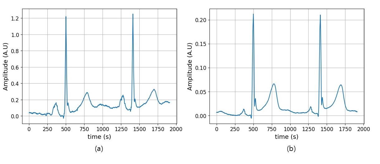 위상 차이(phase difference)로 인해 진폭(amplitude) 차이가 발생하였다. 이러한 차이는 각 피험자의 심전도 신호가 가지는 고유의