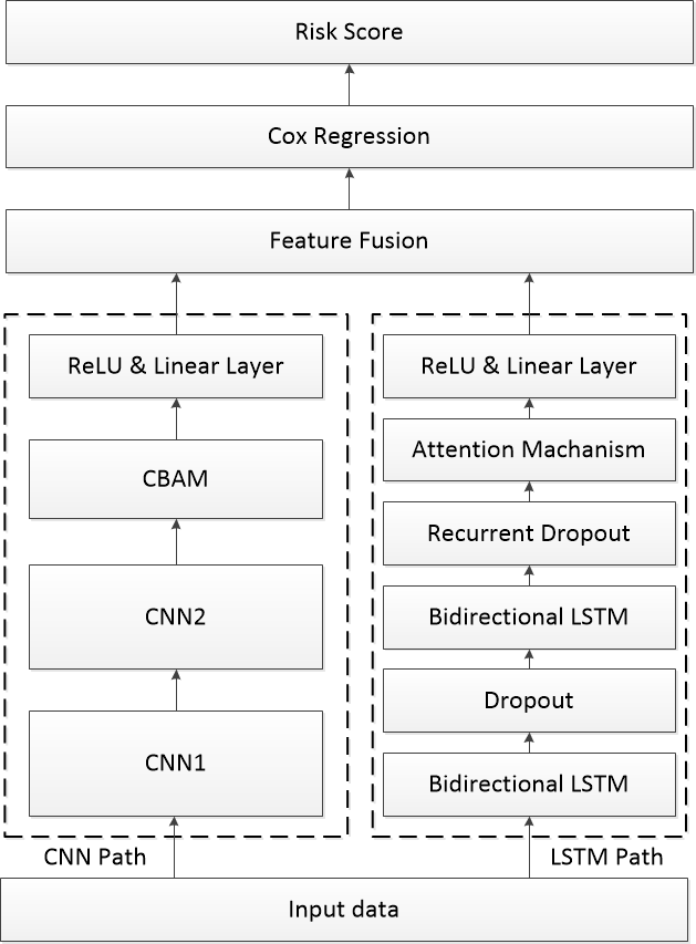 3. Cox Regression: 두 경로에서 추출된 특징이 융합 계층을 거친 후, Cox Regression 헤드를 통해 위험 점수를 예측