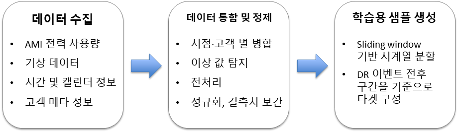 본 연구에서는 수요반응(Demand Response, DR) 감축량 예측 모델을 개발하기 위하여, 그림 1과 같이 고해상도 전력 사용 데이터를 수집·저장할 수 있는 고객 단위 AMI 데이터를 중심으로, 외부 상황 정보를 포함한 다변량 입력 구조를 구성하였다.