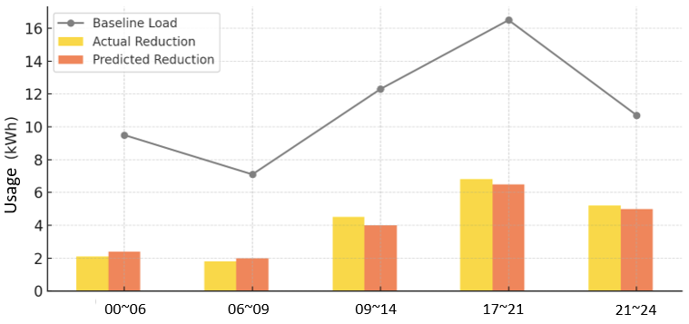 또한, 시간대별 감축량 비교 분석을 통해 예측값이 실제 감축 패턴을 잘 반영하고 있으며, 국내 평균 부하 곡선과의 비교를 통해 현실적인 적용 가능성을