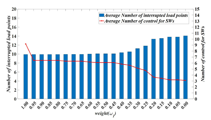 적용하여 고장에 대한 복구 해를 결정한다. 앞서의 식 (13)을 운영 목적에 따라 최소 개폐기 조작에 치중한 $\omega_{1}$과 $\omega_{2}$를 지정하는 경우 부하 복구율이 저하될 수 있다. 이러한