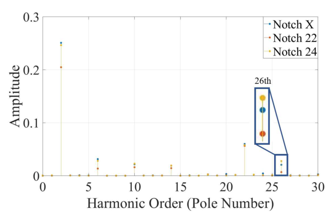 발생하는 공간 고조파 성분은 극 수와 슬롯 수의 합과 차에 의해 유발되며, 회전자에 해당 차수만큼 노치를 배치하면 이 성분을 상쇄할 수 있음이 확인된다.