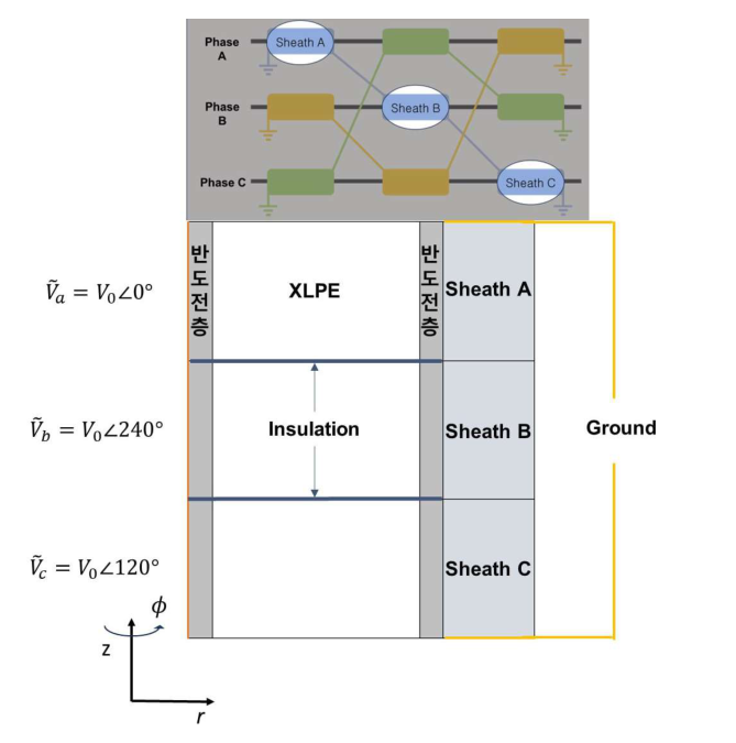 시스에 형성되는 유도전압의 수치해석의 타당성을 검증하기 위하여, 단순화된 해석적 모델을 도입하였다. 트레포일 배열에서 시스에 형성되는 전기장은 식