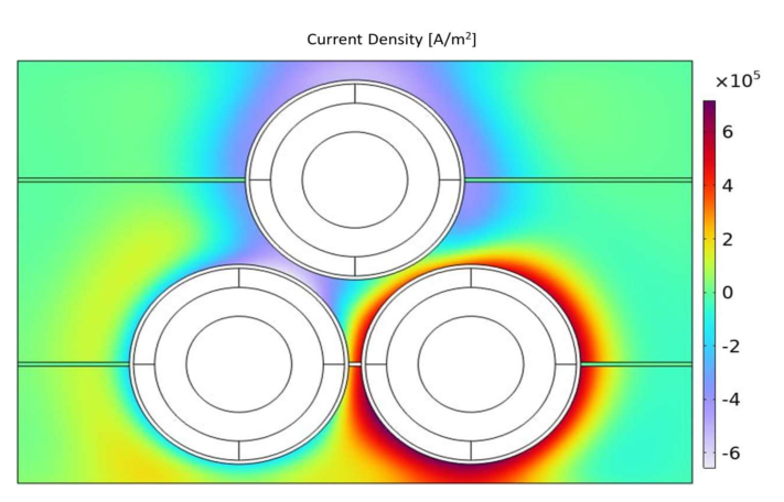 위상차가 $120^{\circ}$인 교류 전류가 각 케이블에 인가되었다. 해석 결과 자기장 성분에 의해 시스에 유도된 전압의 크기는 19.3 V로