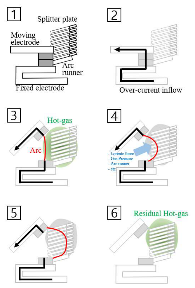 및 분할의 과정을 통해 소호된다. 또한, 아크가 접촉한 Splitter plate에서는 과전류의 에너지를 소모함으로써, 과전류의 크기를 제한하고,