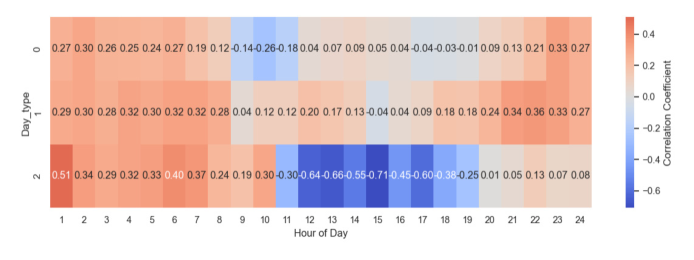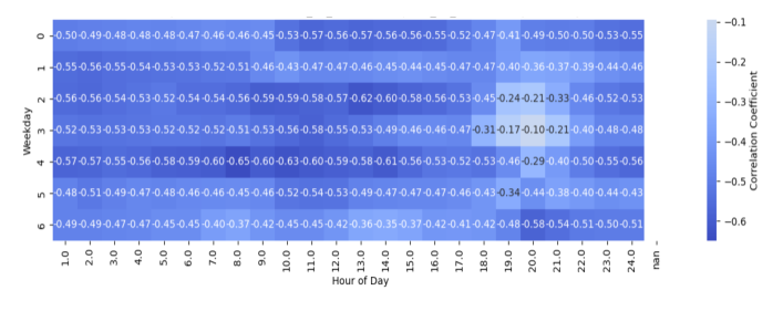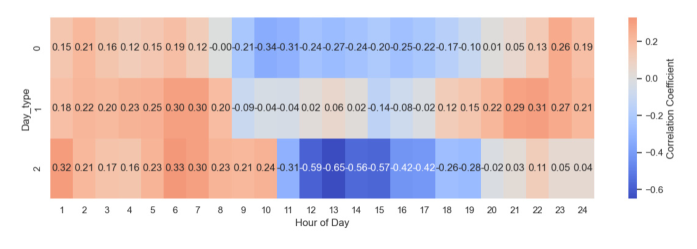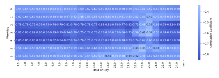 그림 16. 재생에너지 발전량과 SMP의 요일-시간별 부분 상관계수