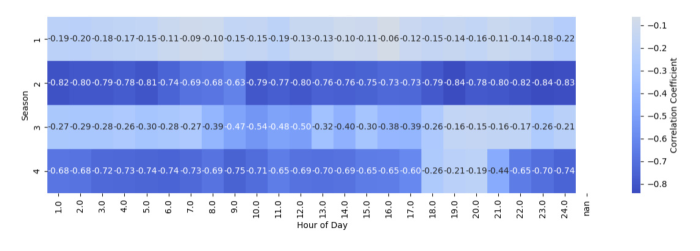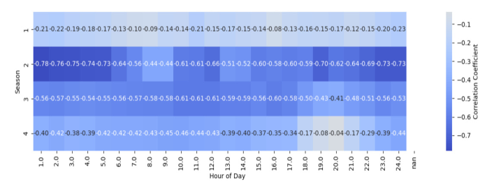 그림 18. 재생에너지 발전량과 SMP의 계절-시간별 부분 상관계수