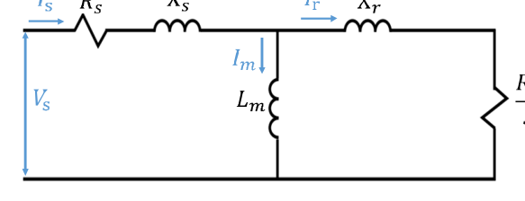 $R_r$은 회전자 저항이며, $X_s$는 고정자 리액턴스이고, $X_r$은 회전자 리액턴스이다. $L_m$은 자속의 형성에 사용되는 자화 인덕턴스이며,