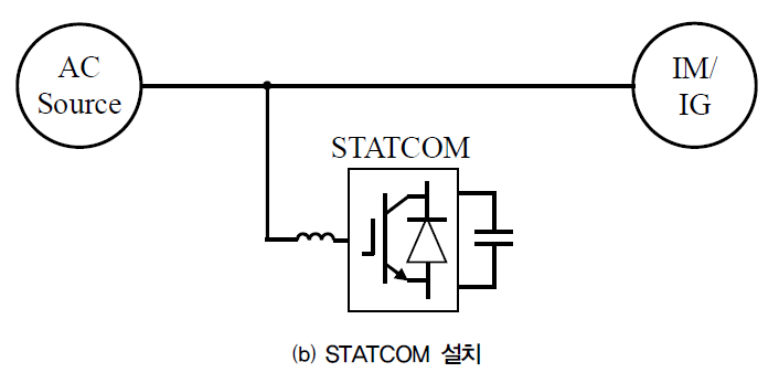 앞에서 설명한 바와 같이, 소용량 유도기의 경우에는 전원과 유도기 사이의 역률을 개선하기 위해 그림 3(a)와 같이 커패시터와 같은 간단한 역률 보상 장치 설치가 유효하고 대용량 유도기의 경우에는 그림 3(b)와 같이, 부하 또는 발전량 변동에 능동적으로 대응이 가능한 STATCOM과 같은 능동형 보상 장치를 사용하는 것이 더 효과적이다[13].