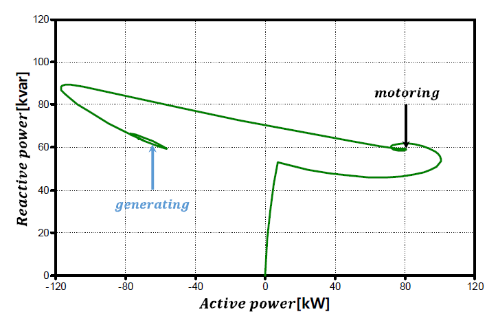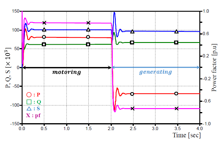 크기라도 발전기로 운전할 때의 역률이 전동기로 운전할 때보다 낮음을 확인하였고 이에 따라, 전동 모드보다는 발전 모드 운전에 필요한 무효전력의 보상량을