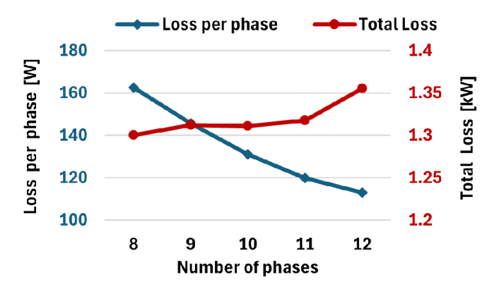 이를 위해 표 2의 설계 사양을 기반으로 상 수 변화에 따른 부피, 효율 및 접합 온도를 종합적으로 고려하여 최적의 상 수를 결정하고, 55kW급 다상 인터리브드