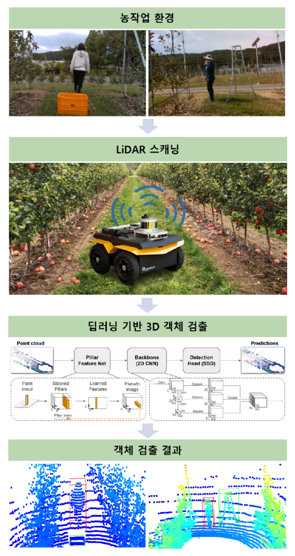 실제 농작업 환경에서 LiDAR를 통하여 실시간으로 포인트 클라우드 데이터를 취득하고, 이를 학습된 딥러닝 기반의 3D 객체 검출 모델을 사용하여