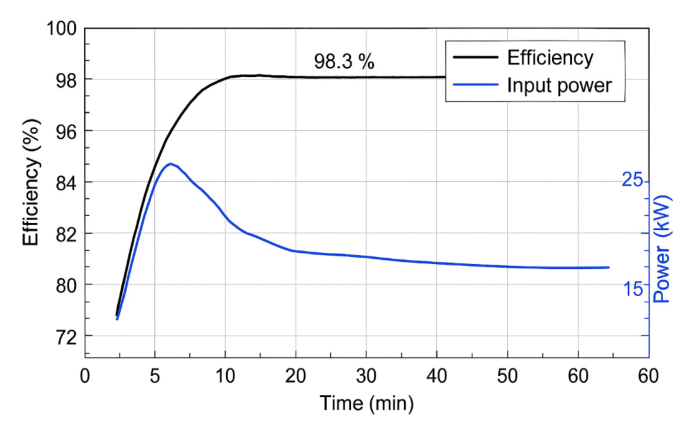 약 40분 경과 시 평균 효율은 96.5%에 도달하였으며, 최대 효율은 98.3%로 측정되었다.