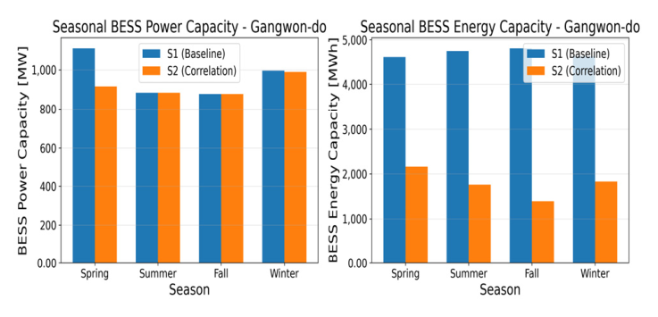 비해 상관관계 가중치를 도입한 시나리오(S2)는 BESS 에너지 용량이 유의미하게 감소하는 경향을 보였다. 또한 재생에너지 규모 차이를 보정 하여