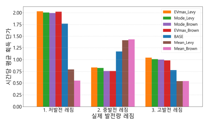 그림 13은 최상위 성과를 보인 EVmax_Levy와 차상위 전략 간의 격차를 나타낸다. 그림 13을 살펴보면 특히 두 전략 중 평균 획득 단가가 더 높았던 EVmax_Levy가 지속적으로 우위를 점하고 있음을 확인할 수 있다. 그림 14는 3장에서 정의된 세 가지, 저발전·중발전·고발전 레짐별 시나리오 생성 방식이 정산 단가에 어떻게 반영되는지를 보여준다. 각 레짐은 앞서 모델 구성