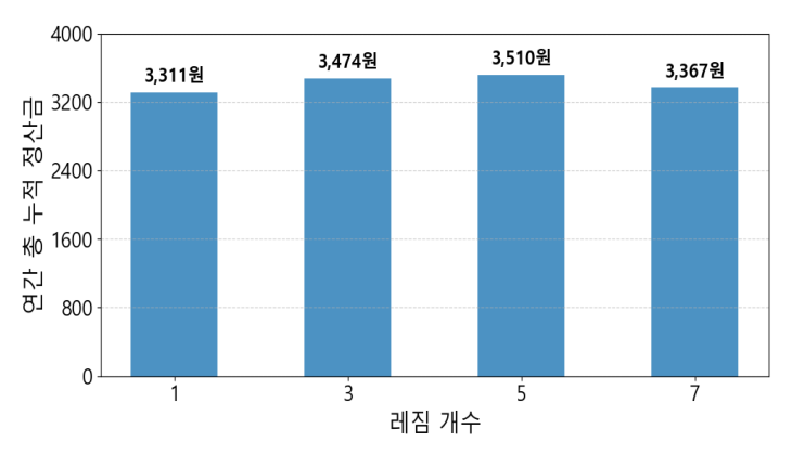 결과를 나타낸다. 레짐 1개에서는 3,311원, 3개에서는 3,474원, 5개에서는 3,510원, 7개에서는 3,367원으로 나타난다. 즉 레짐 개수에