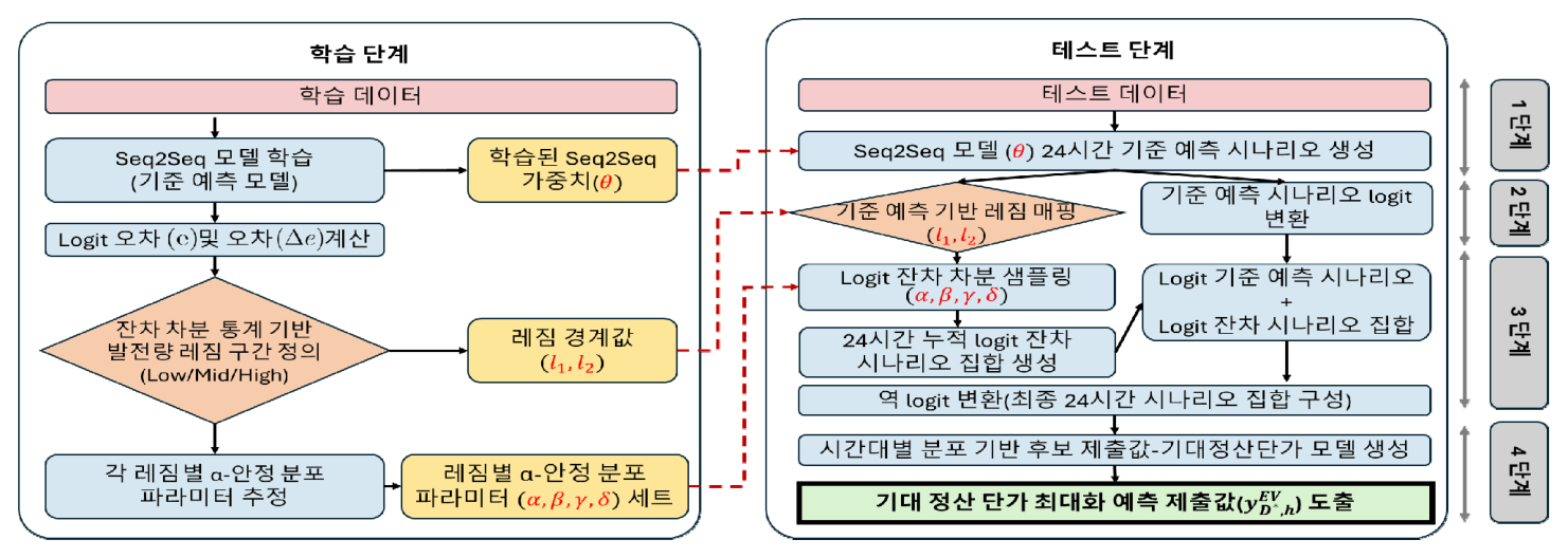 예측 모델로부터 비정규·비대칭 특성을 반영한 예측 분포를 구성하고, 이를 계단형 정산 단가 구조 기반의 경제적 최적화를 결합한 통합 확률론적 예측값