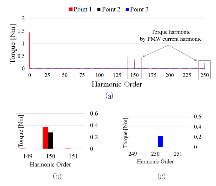 그림 11. 포인트에 따른 토크 FFT 결과 (a) 토크 FFT (b) 고조파 150차수 확대 (c) 고조파 250차수 확대