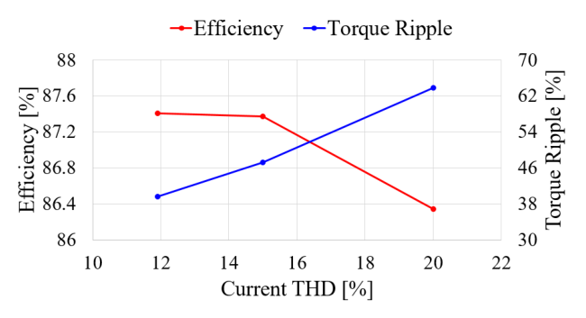 Fig. 12. Relationship of current THD, efficiency, and torque ripple