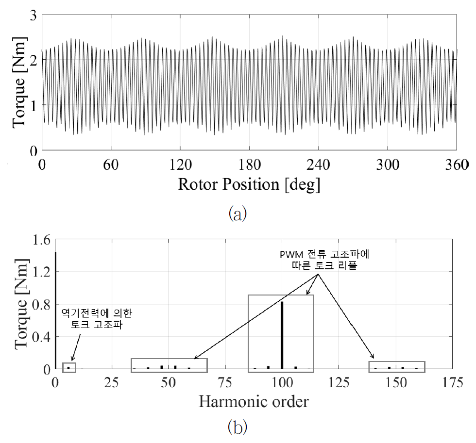 여기서 $h$는 PWM에 의한 고조파 차수를 의미하여 $h \pm 1$이 3의 배수을 만족하는 차수이다. 식 (7)로부터 전류의 리플성분이 토크에 영향을 미치는 것을 알 수 있다.