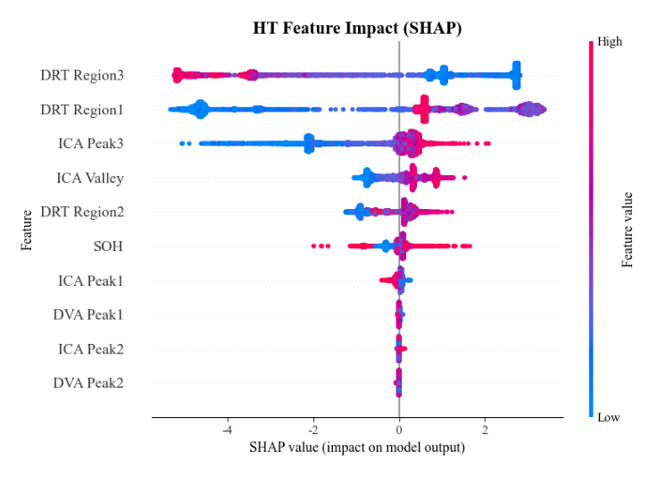상온 노화의 경우, 그림 9에서 DRT Region1·2의 높은 값은 주로 음(-)의 방향으로 분포하고 있다. 이는 두 특성 인자가 커질수록, 모델이 해당 샘플을 RT 환경이 아닐 가능성이 높다고 판단했음을 의미한다. 즉, DRT Region1·2가 높은 값(빨간색)을 가질 때 모델은 RT보다는 HT나 LT 환경으로 인식했고, 반대로 두 특성 인자가 낮은 값(파란색)을 가질 때 모델은 RT 환경으로 판단하는 경향을 보였다. DRT의 Region1·2는 일반적으로 고주파~중주파수 영역에 해당하며, 이 구간은 전해질, 집전체-활물질 계면에서의 전하전달 저항과 관련된다. 상온 조건에서는 이 반응이 원활하여 해당 Peak 강도가 상대적으로 작고, 임피던스 응답이 안정적으로 유지되기 때문에 DRT Region1·2 값이 낮은 경우가 오히려 상온 환경의 전형적인 특성을 반영한다고 해석할 수 있다.